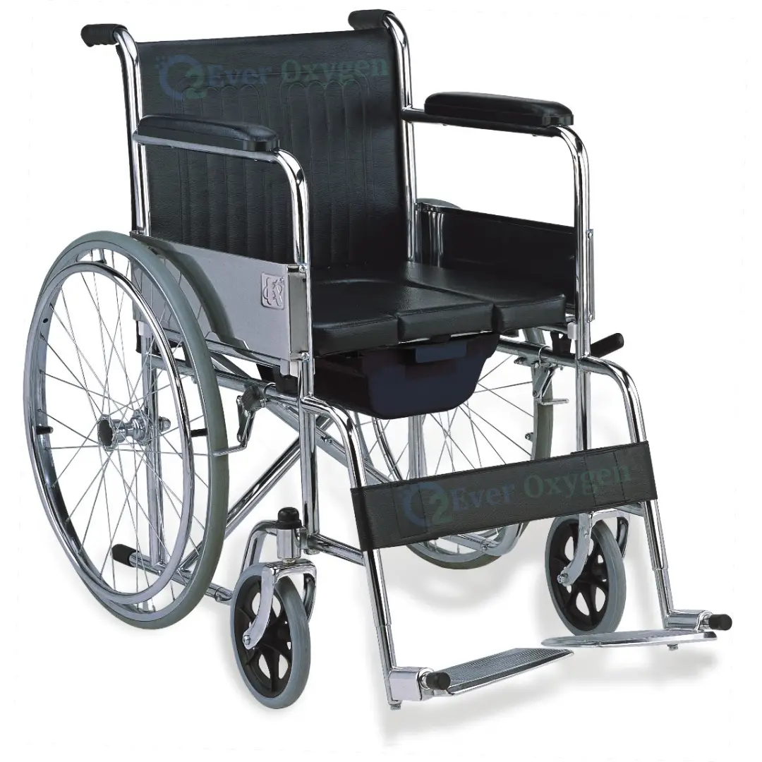 Commode wheelchair with slide-out tray price in Bangladesh starts from ৳11,500 at Ever Oxygen BD. Unlike the standard bucket-type commode wheelchair, this single seat model features a slide-out tray — the patient can use the toilet simply by pulling the tray forward, without standing or transferring to another chair.