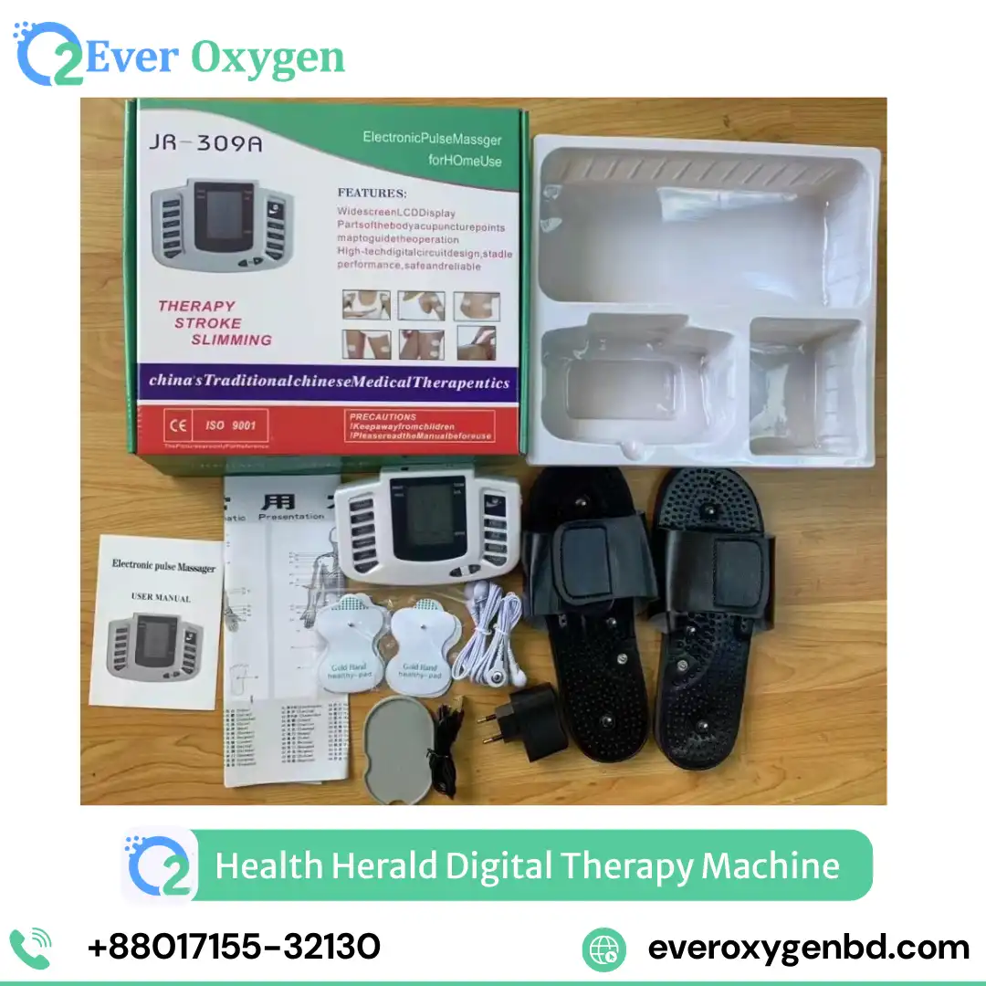 Q: What is the TENS therapy machine price in Bangladesh? The JR-309A TENS therapy machine starts from ৳1,700 at Ever Oxygen BD — with electric massage shoes, 4 electrode pads and USB cable included. Free delivery in Dhaka. Call 01715532130.
